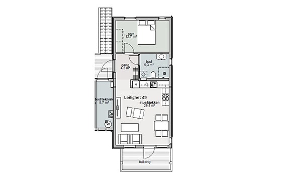 - Praktisk utebod ved inngangspartiet på ca. 5,7 kvm