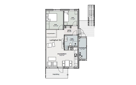 - Utebod ved inngangspartiet på ca. 5,7 kvm
