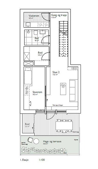 1. etasje: Gang og trapp. Vaskerom med benk, utslagsvask og opplegg for vaskemaskin og tørketrommel. Baderom med dusj, wc og vask. Innvendig bod. 1 soverom. Stue med utgang til terrasse og hage. Redskapsbod på terrassen.