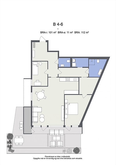 Hjørneleilighet med stor sørvendt terrasse. Utsikt mot vågen fra terrassen.