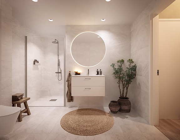Et godt baderom handler vel så mye om velvære om som kroppspleie, og i Støperiet har dette fått stor oppmerksomhet. Rommene blir en forlengelse av kvalitetene, teksturene og fargevalgene du finner i leiligheten ellers. Illustrasjon av bad i B602.