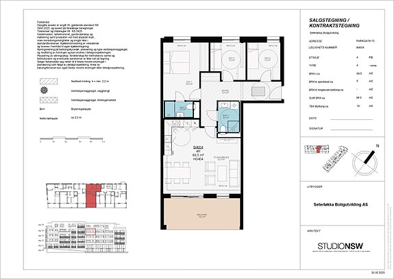 Det blir utstedt energiattest for den enkelte leilighet. Boligens varmetap og energibehov er dimensjonert iht. teknisk forskrift av 2017, TEK 17. Energimerkingen er beregnet til å ligge i kategori A til B. Det tas forbehold for at avvik kan forekomme spesielt i leiligheter med mye vindusflate.
