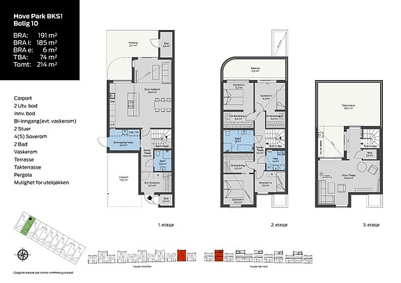 - 3 uteplasser - Treplatting med hage i første, romslig balkong i andre etasje og en fantastisk takterrasse i tredje etasje.