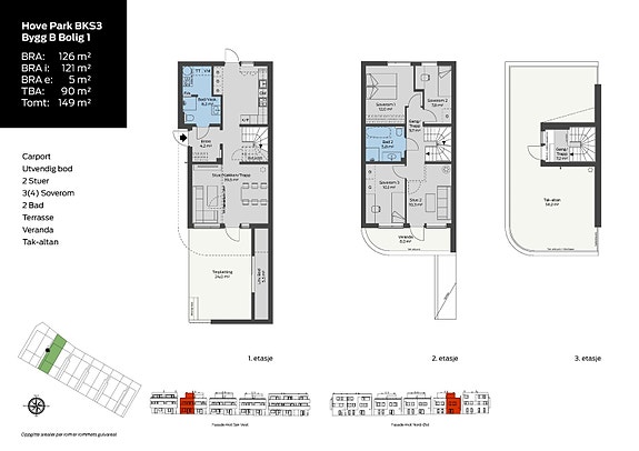- Uteplasser i hver etasje med takterrasse på 52 m2 øverst