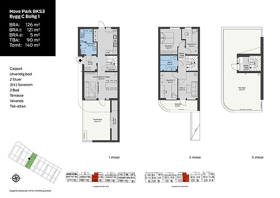 - Uteplasser i hver etasje med takterrasse på 52 m2 øverst