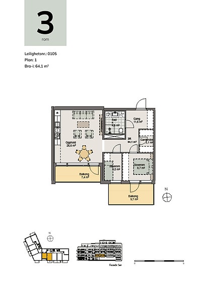 Bruksareal: 64,10 kvm, BRA-i: 64,10 kvm , TBA: 9,70 kvm