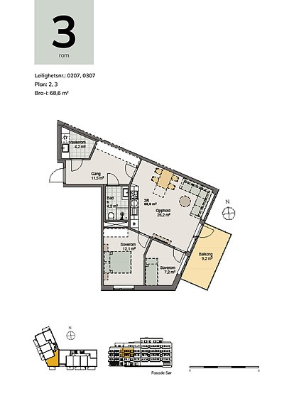 Soverom: 2, Antall rom: 3