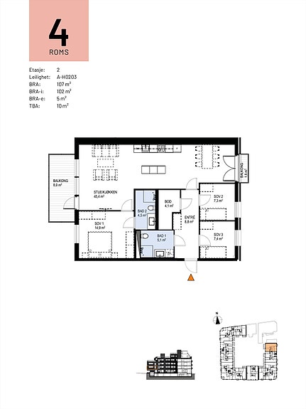 Arealet er beregnet ut fra Norsk standard NS 3940:2023. BRA-i: Internt arealet innenfor boligens omsluttende vegger, inkludert sjakt. BRA-e: Eksternt areal som boligen har eksklusiv bruksrett til, men som ikke ligger i boligen, f.eks. kjellerbod. BRA-b: Areal for innglasset balkong med veggareal. Total BRA = Summen av BRA-i, BRA-e og BRA-b. TBA er areal på terrasse og balkong. Arealet oppgis ved salg, men inngår ikke i BRA. Oppgitt romareal er netto romareal. De oppgitte arealer er å betrakte som cirka-arealer. Partene har ingen krav mot hverandre dersom arealet skulle vise seg å være 5 % mindre / større enn det oppgitte areal.