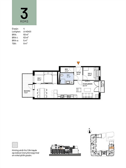Arealet er beregnet ut fra Norsk standard NS 3940:2023. BRA-i: Internt arealet innenfor boligens omsluttende vegger, inkludert sjakt. BRA-e: Eksternt areal som boligen har eksklusiv bruksrett til, men som ikke ligger i boligen, f.eks. kjellerbod. BRA-b: Areal for innglasset balkong med veggareal. Total BRA = Summen av BRA-i, BRA-e og BRA-b. TBA er areal på terrasse og balkong. Arealet oppgis ved salg, men inngår ikke i BRA. Oppgitt romareal er netto romareal. De oppgitte arealer er å betrakte som cirka-arealer. Partene har ingen krav mot hverandre dersom arealet skulle vise seg å være 5 % mindre / større enn det oppgitte areal.