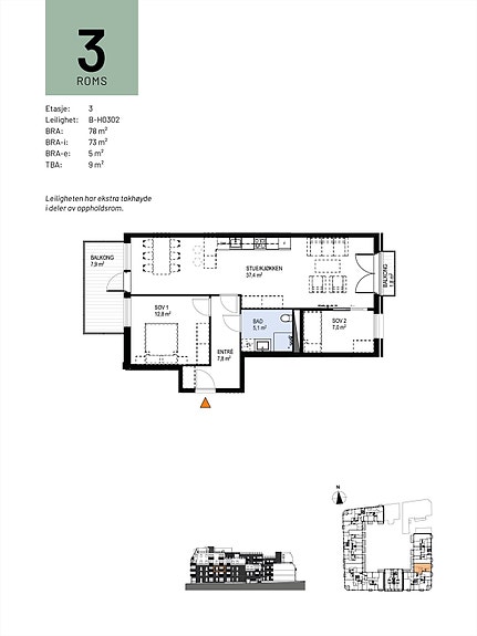 Arealet er beregnet ut fra Norsk standard NS 3940:2023. BRA-i: Internt arealet innenfor boligens omsluttende vegger, inkludert sjakt. BRA-e: Eksternt areal som boligen har eksklusiv bruksrett til, men som ikke ligger i boligen, f.eks. kjellerbod. BRA-b: Areal for innglasset balkong med veggareal. Total BRA = Summen av BRA-i, BRA-e og BRA-b. TBA er areal på terrasse og balkong. Arealet oppgis ved salg, men inngår ikke i BRA. Oppgitt romareal er netto romareal. De oppgitte arealer er å betrakte som cirka-arealer. Partene har ingen krav mot hverandre dersom arealet skulle vise seg å være 5 % mindre / større enn det oppgitte areal.
