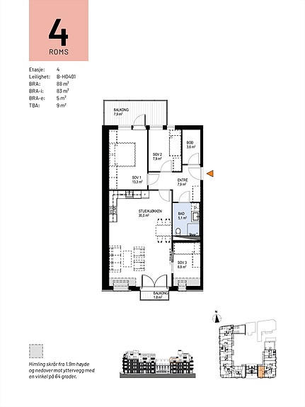 Arealet er beregnet ut fra Norsk standard NS 3940:2023. BRA-i: Internt arealet innenfor boligens omsluttende vegger, inkludert sjakt. BRA-e: Eksternt areal som boligen har eksklusiv bruksrett til, men som ikke ligger i boligen, f.eks. kjellerbod. BRA-b: Areal for innglasset balkong med veggareal. Total BRA = Summen av BRA-i, BRA-e og BRA-b. TBA er areal på terrasse og balkong. Arealet oppgis ved salg, men inngår ikke i BRA. Oppgitt romareal er netto romareal. De oppgitte arealer er å betrakte som cirka-arealer. Partene har ingen krav mot hverandre dersom arealet skulle vise seg å være 5 % mindre / større enn det oppgitte areal.
