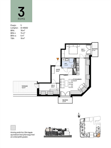Arealet er beregnet ut fra Norsk standard NS 3940:2023. BRA-i: Internt arealet innenfor boligens omsluttende vegger, inkludert sjakt. BRA-e: Eksternt areal som boligen har eksklusiv bruksrett til, men som ikke ligger i boligen, f.eks. kjellerbod. BRA-b: Areal for innglasset balkong med veggareal. Total BRA = Summen av BRA-i, BRA-e og BRA-b. TBA er areal på terrasse og balkong. Arealet oppgis ved salg, men inngår ikke i BRA. Oppgitt romareal er netto romareal. De oppgitte arealer er å betrakte som cirka-arealer. Partene har ingen krav mot hverandre dersom arealet skulle vise seg å være 5 % mindre / større enn det oppgitte areal.
