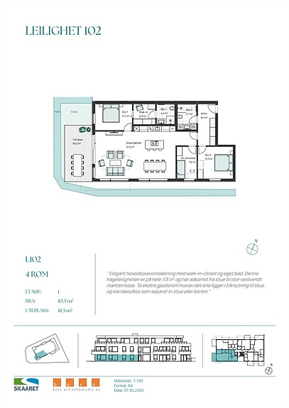 Elegant hovedsoveromsløsning med walk-in-closet og eget bad. Denne hageleiligheten er på hele 113 kvm og har adkomst fra stue til stor vestvendt markterrasse. To ekstra gjesterom hvorav det ene ligger i tilknytning til stue og kan benyttes som separat tv stue eller kontor.