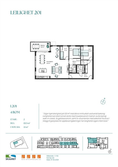 Diger hjørneleilighet på 120 kvm med delvis inntrukket vestvendt balkong. Leiligheten kan blant annet skilte med hovedsoverom med en-suite bad og walk-in-closet, to gjestesoverom, samt tv-stue/kontor med adkomst fra stue. I tillegg til god plass for oppbevaringløsninger har leiligheten egen intern bod.