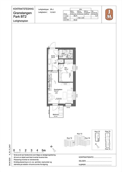 Arealet er beregnet ut fra Norsk standard NS 3940:2023. BRA-i: Internt arealet innenfor boligens omsluttende vegger, inkludert sjakt. BRA-e: Eksternt areal som boligen har eksklusiv bruksrett til, men som ikke ligger i boligen, f.eks. kjellerbod. BRA-b: Areal for innglasset balkong med veggareal. Total BRA = Summen av BRA-i, BRA-e og BRA-b. TBA er areal på terrasse og balkong. Arealet oppgis ved salg, men inngår ikke i BRA. Oppgitt romareal er netto romareal. De oppgitte arealer er å betrakte som cirka-arealer. Partene har ingen krav mot hverandre dersom arealet skulle vise seg å være 5 % mindre / større enn det oppgitte areal.
