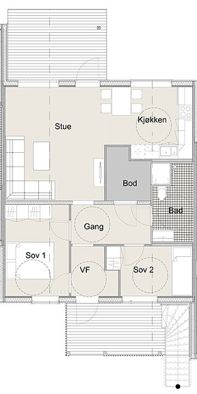 Leilighet med 2 soverom, stue, kjøkken, bad og bod.
