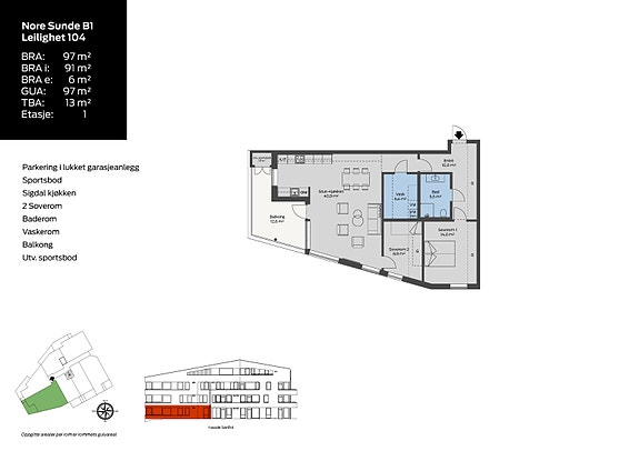 - Parkeringsplass i lukket garasjeanlegg (gjelder ikke for leilighet 102, 103, 105, 106, 201 og 206)