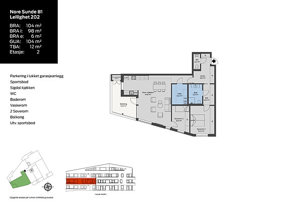 - Parkeringsplass i lukket garasjeanlegg (gjelder ikke for leilighet 102, 103, 105, 106, 201 og 206)