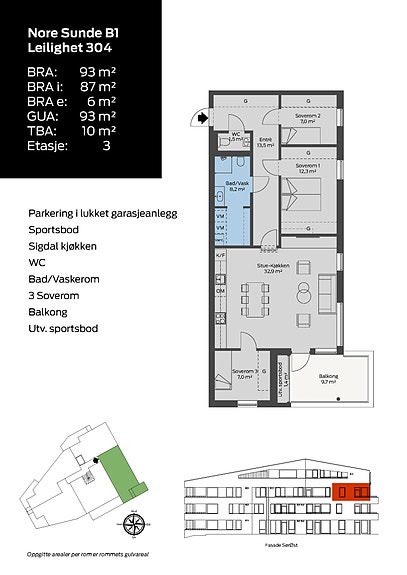 - Parkeringsplass i lukket garasjeanlegg (gjelder ikke for leilighet 102, 103, 105, 106, 201 og 206)