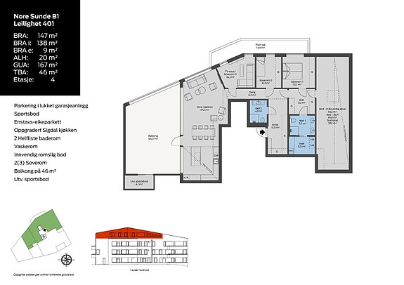 - Parkeringsplass i lukket garasjeanlegg (gjelder ikke for leilighet 102, 103, 105, 106, 201 og 206)