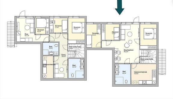 Stor gang, vaskerom, bad/wc og to soverom. I tillegg hybel (25 kvm) med egen inngang, stue/kjøkken, soverom og bad/wc.