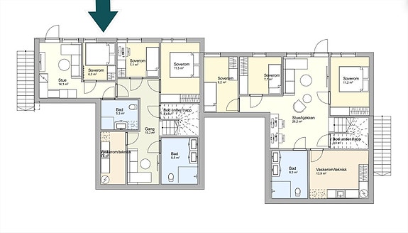 Stor tv-stue på 26 kvm, vaskerom (14 kvm), bad/wc og tre soverom. Bod under trapp. Denne boligen kan også leveres med hybel mot pristillegg. Kontakt megler for mer informasjon.