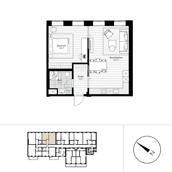Stor 2-roms med takhøyde på hele 3,4 meter. Leiligheten inneholder entré/ gang med plass til garderobe, åpen stue- og kjøkkenløsning med plass til både sofa- og spisegruppe, romslig soverom med god plass til dobbeltseng og garderobe, samt et delikat flislagt bad med opplegg for vaskemaskin. Kjøkkenet i L-form med integrerte hvitevarer og godt med skap- og benkeplass.