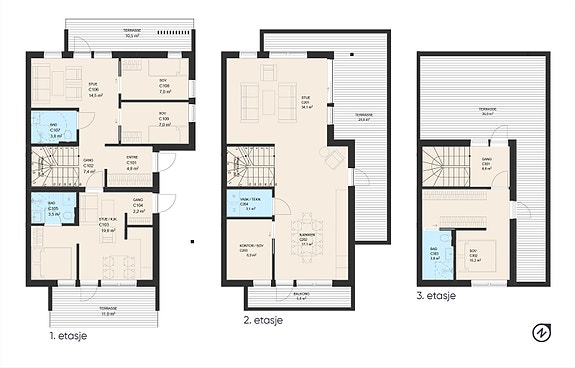 Entré, 2 bad/wc 3 soverom, 2 stuer. Terrasse mot øst og vest. Deler av denne etasjen kan leveres som hybel - se plantegning.