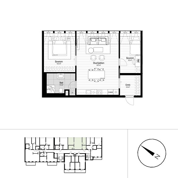Lys og stor 3-roms i byggets 4.etasje. Leiligheten inneholder entré/ gang med garderobeplass, åpen- stue og kjøkkenløsning med god plass til både sofa- og spisegruppe, to soverom med plass til dobbeltseng og garderobe. Delikat flislagt bad med opplegg for vaskemaskin. Det er store takvinduer som gir rikelig med naturlig lys inn i boligen, samtidig som man får god kontakt med omgivelsene.