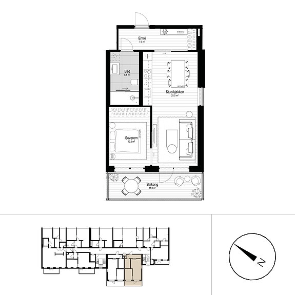 Lys og stor 2-roms med meget god planløsning og sydvestvendt balkong på 11 kvm. Leiligheten inneholder en entré/ gang med plass til garderobe, åpen stue- og kjøkkenløsning med plass til både sofa- og spisegruppe, romslig soverom med god plass til dobbeltseng og garderobe, samt et delikat flislagt bad med egen dusjnisje og opplegg for vaskemaskin.