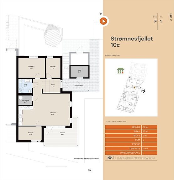 En romslig og moderne bolig med tre soverom, åpen stue- og kjøkkenløsning og et stilrent bad.