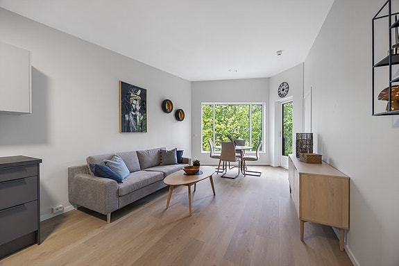 Åpen stue/kjøkken-løsning med plass til sofagruppe og spisegruppe. Kjøkken fra Sigdal: Vidde Granitt 0103. Hvitevarene er levert av Skousen og inneholder induksjonstopp, innbygningsovn, oppvaskmaskin, kombiskap kjøl/frys og ventilator med plasmafilter. Fra den åpne stue-/kjøkkenløsningen er det dør ut til vestvendt balkong.