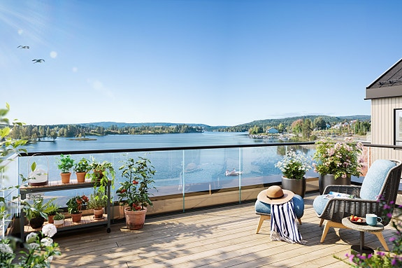 Fra leilighet blir det nydelig utsikt mot Einafjorden. Her illustrert fra leiligheten over, B301. Illustrasjon- avvik vil forekomme.