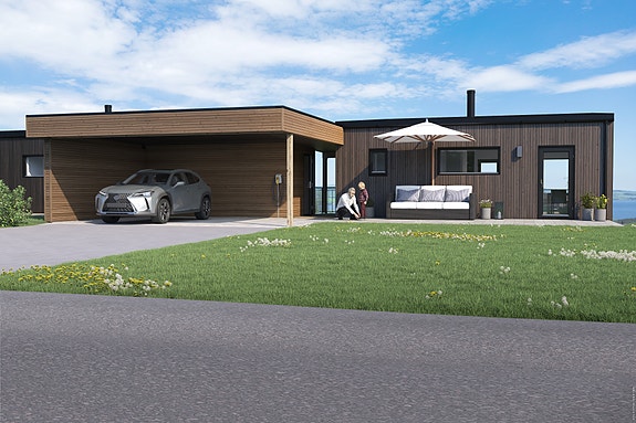 Dobbel carport med sportsbod i bakkant. Utgang fra kjøkkenet til fine utearealer. Illustrasjon av inngangspartiet.