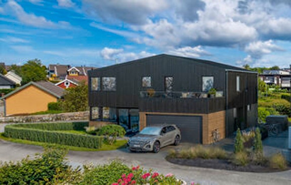 Standard og kvaliteter: Boligen holder høy standard med parkett på de fleste gulv, mens våtrom leveres med fliser. Vinduer og dører i mørk utførelse gir et moderne uttrykk, og taket er tekket med sort papp og dekorlister. Kledningen er solid, med royalimpregnert stående sort og liggende u-pigmentert treverk. Boligen har balansert ventilasjon med varmegjenvinning, NorDan-vinduer og dører i sort utførelse, samt garasjeport fra Gapo.