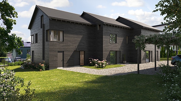 Hver bolig leveres med én parkeringsplass i frittstående carport, oppført med trykkimpregnerte materialer.