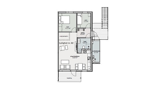 - Utebod plassert ved inngangspartiet på ca. 5,7 kvm