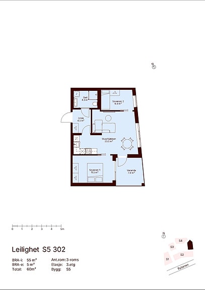Vi har nå for salg trinn 3 som består av bygg S5: S5 består av 23 enheter i bygg som går over 4 hovedplan.