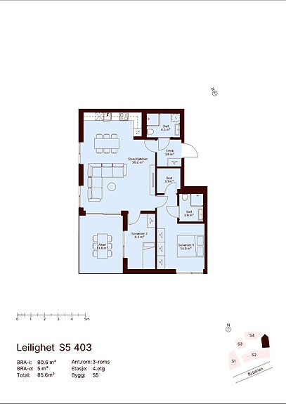 Vi har nå for salg trinn 3 som består av bygg S5: S5 består av 23 enheter i bygg som går over 4 hovedplan.