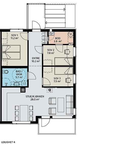 Leilighet 4 ligger i 2. etasje og er østvendt.