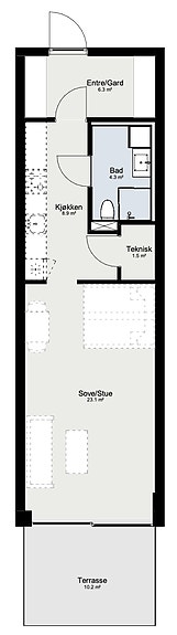 Studioleilighet med stor markterrasse. Perfekt for 1. gangskjøpere eller for deg som ikke trenger så mye plass.