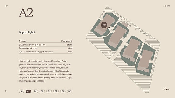 Eksklusive selveierleiligheter organisert som eierseksjonssameie. Leilighetene vil før overtagelse bli seksjonert og tillagt relevant tilleggsareal (tilhørende uteplasser og relevante arealer i parkeringskjeller). Det skal føres opp fire bygg i tre etasjer med tilsammen 8 leiligheter, 2 i hvert bygg.