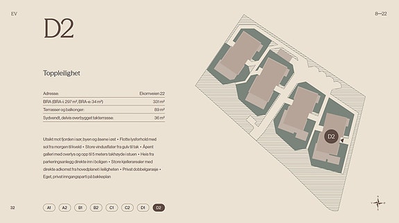 Med utgang til private uteområder og sømløs overgang mellom inne og ute, kombinerer hageleilighetene romslighet med tilbaketrukket ro. Alle har dobbelgarasje, store fleksible kjellerarealer, heis og private uteplasser.