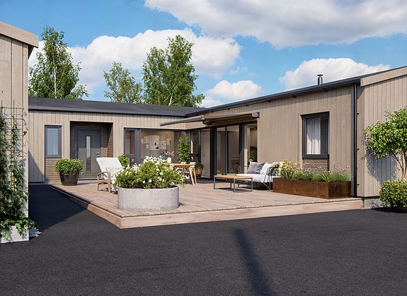 Halvpart tomannsbolig på ett plan i atriumhus med skjermet uteområde, dobbel carport livsløpsstandard