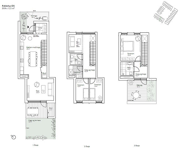 Townhouse D5 går over tre plan med forhage, hage, terrasse og balkong.