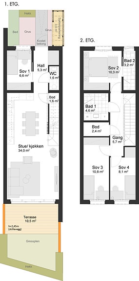 2-plans rekkehus med hage, åpen stue- og kjøkkenløsning med direkte utgang til terrasse. Det er 4 soverom, to bad og wc. Balansert ventilasjon sørger for godt inneklima og lave kostnader til oppvarming. Ny bolig kommer med fem års reklamasjonsrett og oppfølging fra utbygger. Boligen selges inkl. 1 parkeringsplass. Forutsatt ledige plasser kan ekstra parkeringsplass kjøpes. Ta kontakt med selger for mer informasjon.