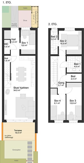 2-plans rekkehus med hage, åpen stue- og kjøkkenløsning med direkte utgang til terrasse. Det er 4 soverom, to bad og wc. Balansert ventilasjon sørger for godt inneklima og lave kostnader til oppvarming. Ny bolig kommer med fem års reklamasjonsrett og oppfølging fra utbygger. Boligen selges inkl. 1 parkeringsplass. Forutsatt ledige plasser kan ekstra parkeringsplass kjøpes. Ta kontakt med selger for mer informasjon.