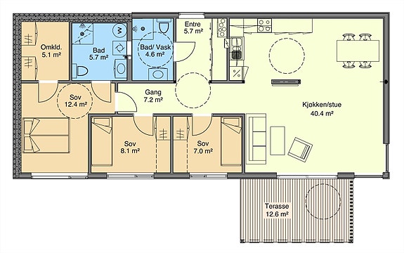 Entrè, bad, 3 soverom, bad/vaskerom, stue og kjøkken.