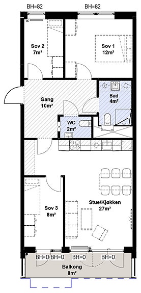 Effektiv 4-roms leilighet med bla. utgang til sydvestvendt balkong både fra stue og 1 soverom, gjestetoalett.