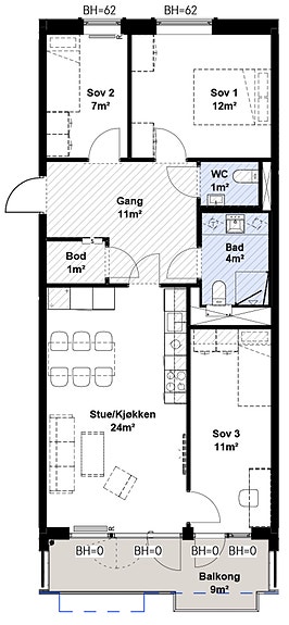 Effektiv og kompakt 4-roms leilighet med bl.a. gjestetoalett og sydvestvendt balkong på 9 kvm. m. to utganger fra to rom